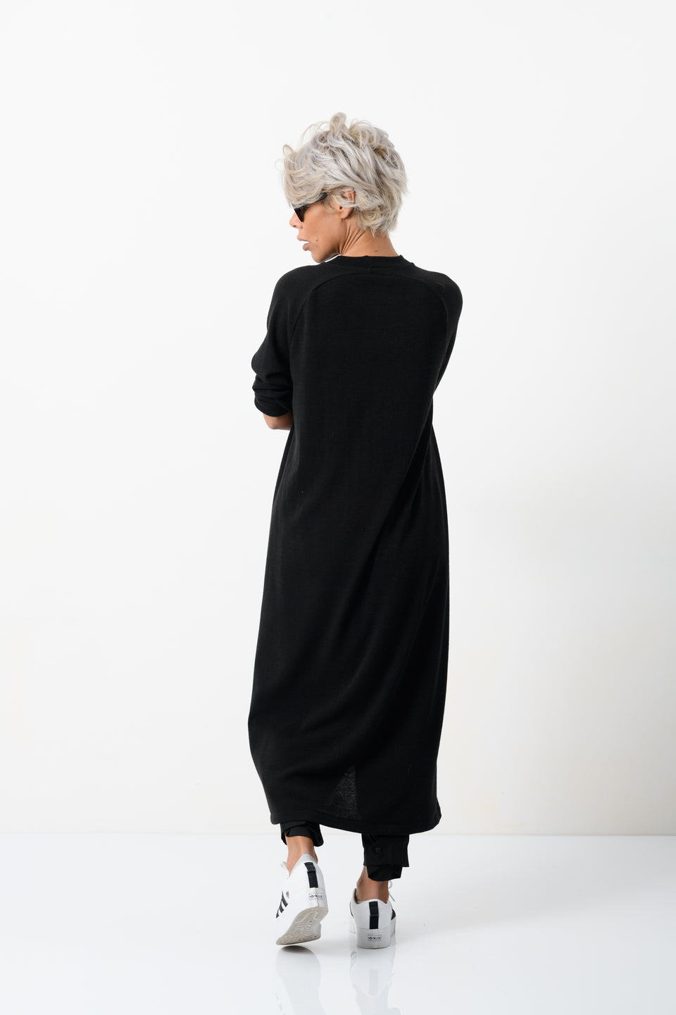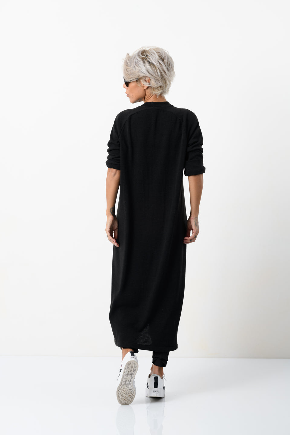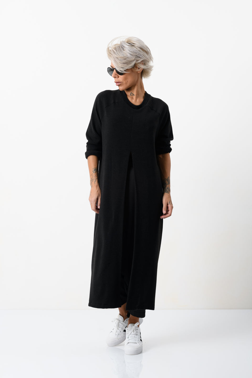 - The dress has a deep front slit, V Neck, and 7/8 sleeves