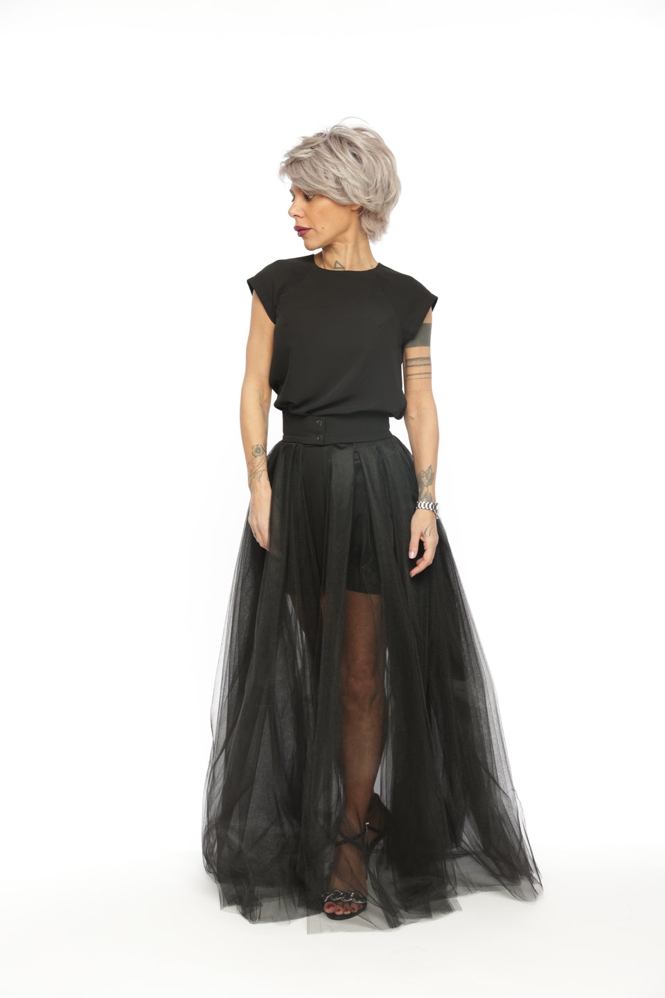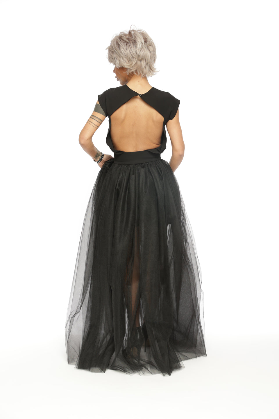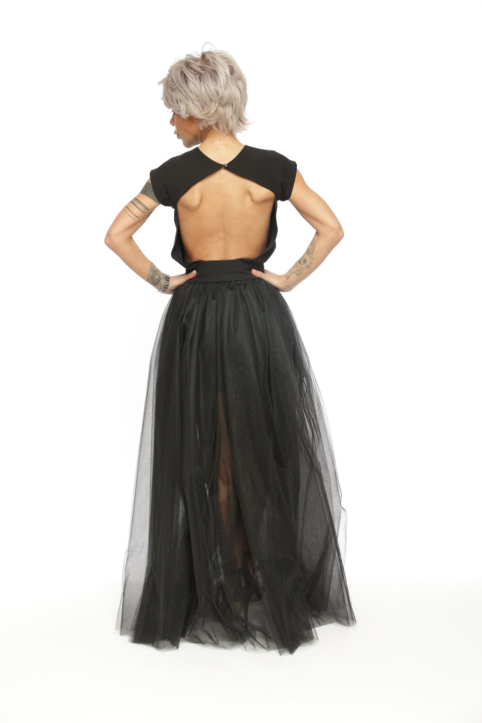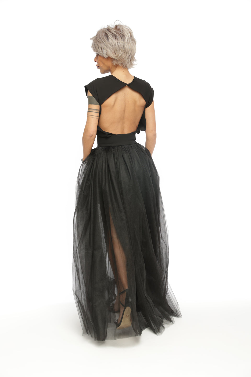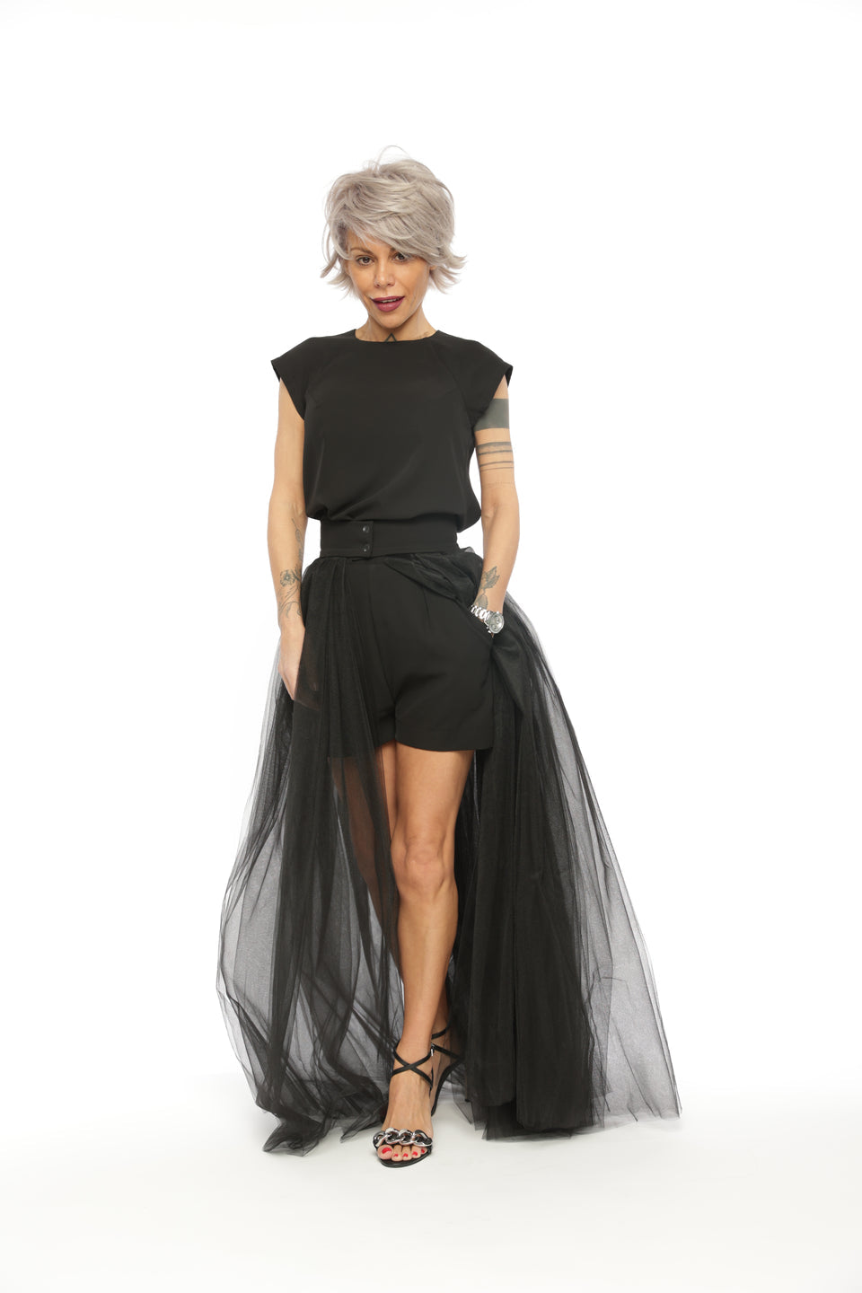 3-PIECE OPEN-BACK TOP, HIGH-WAISTED SHORTS AND TULLE SKIRT CO-ORD SET IN BLACK