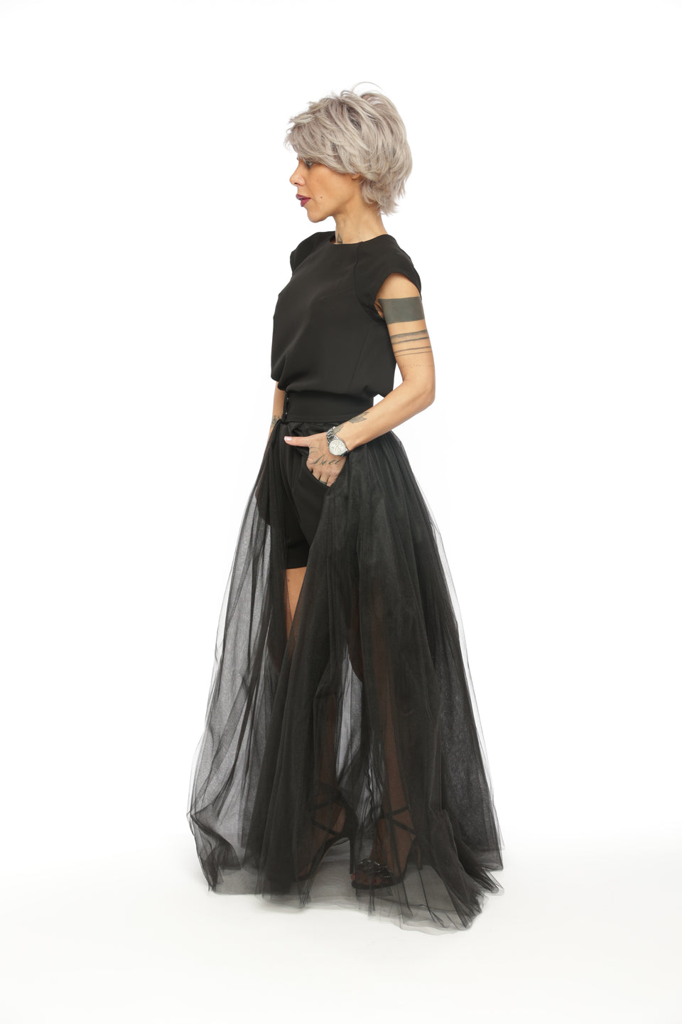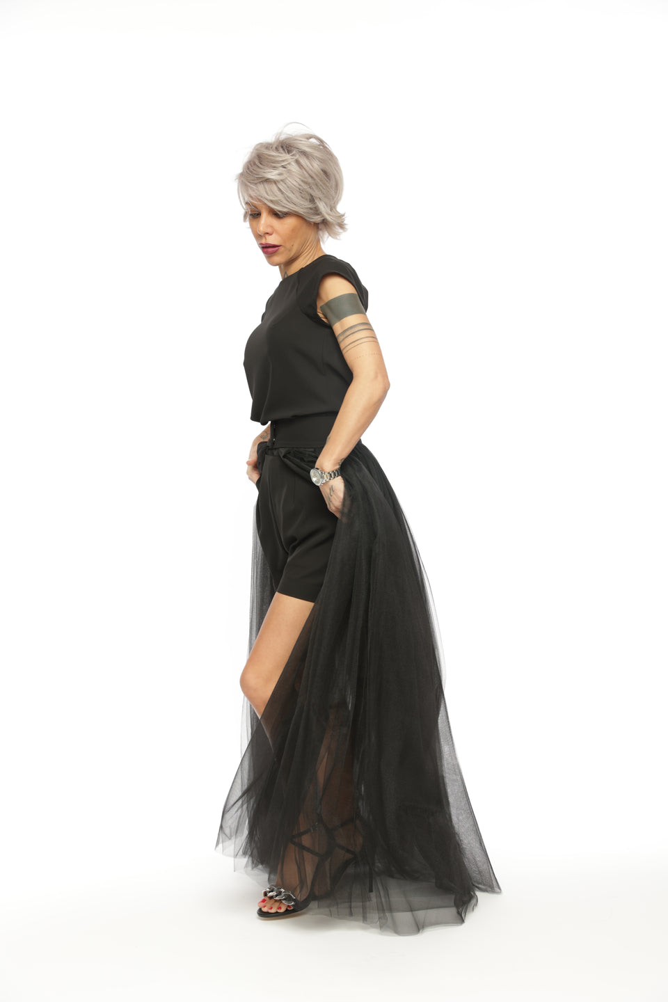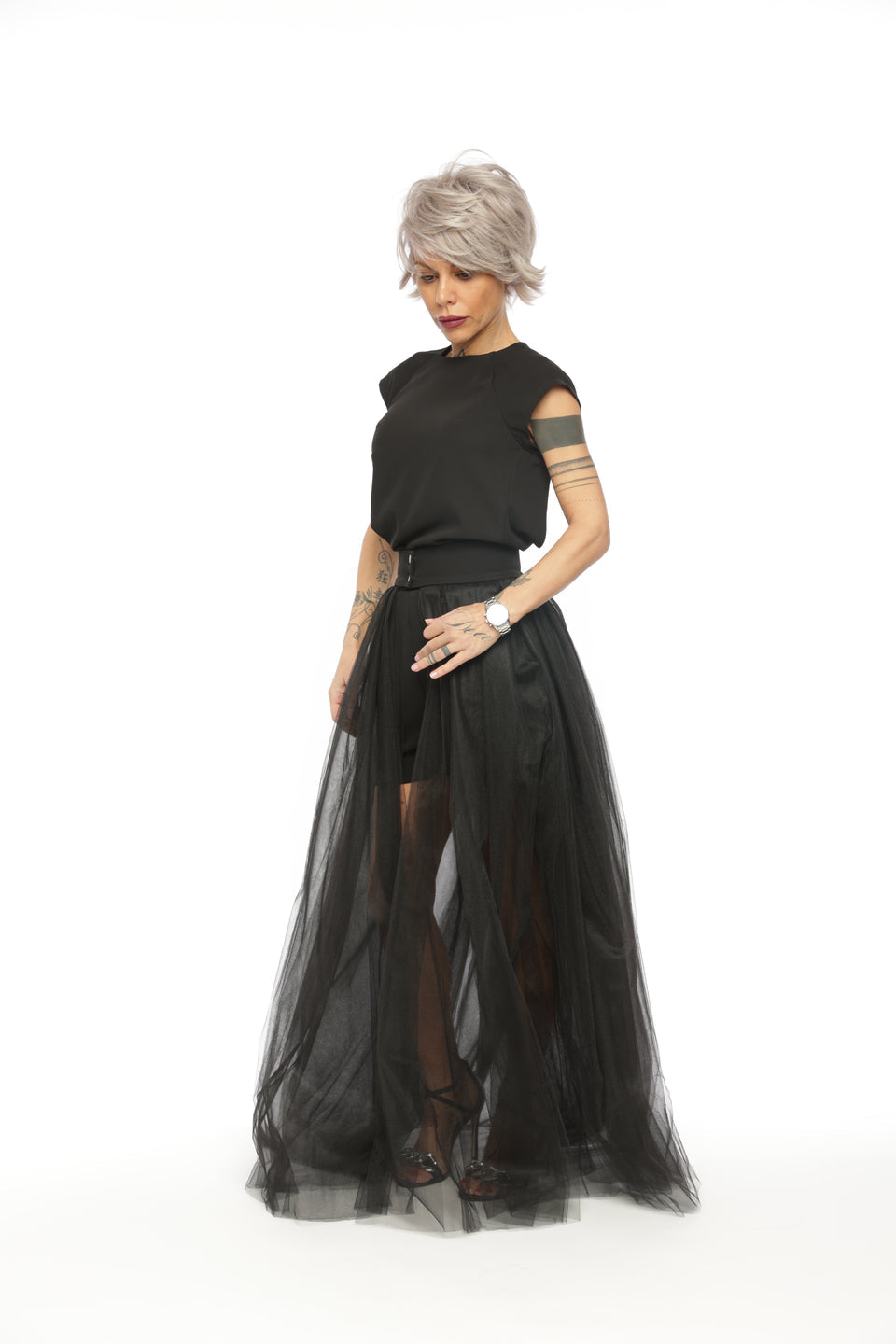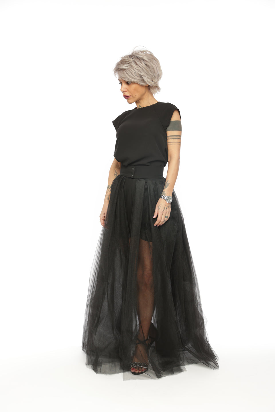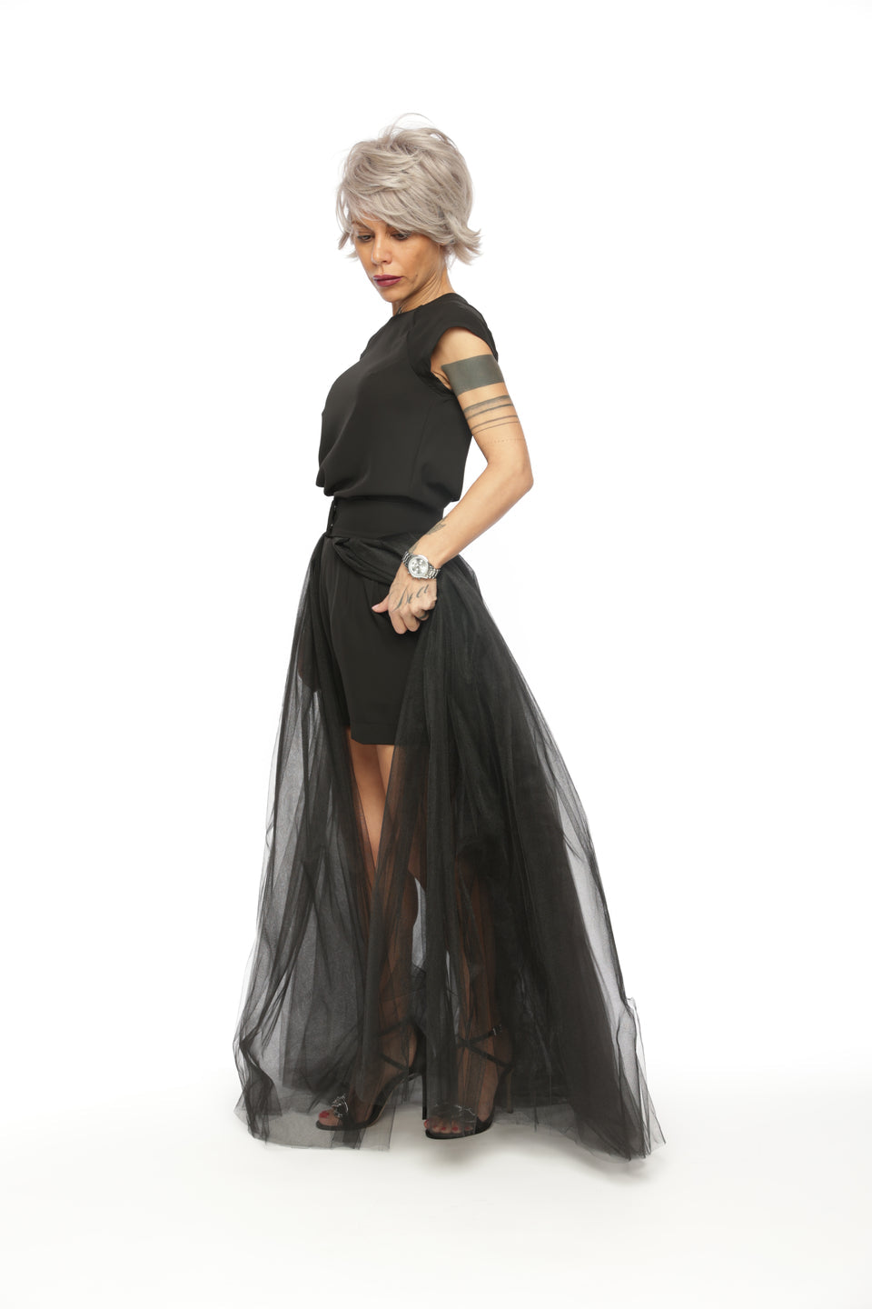 3-PIECE OPEN-BACK TOP, HIGH-WAISTED SHORTS AND TULLE SKIRT CO-ORD SET IN BLACK