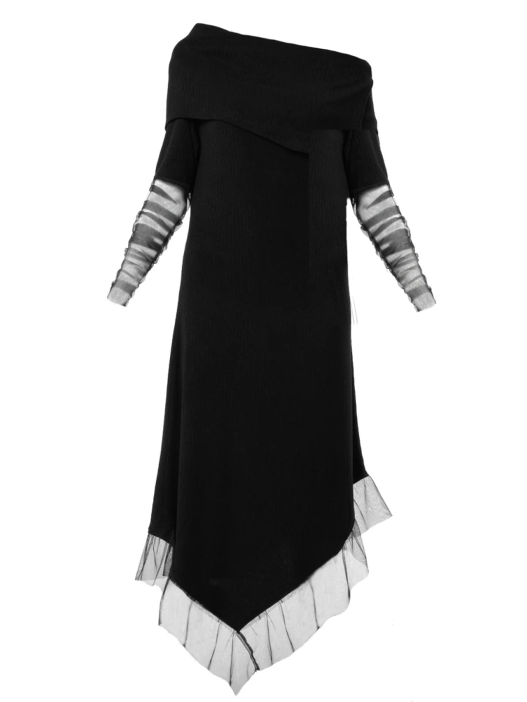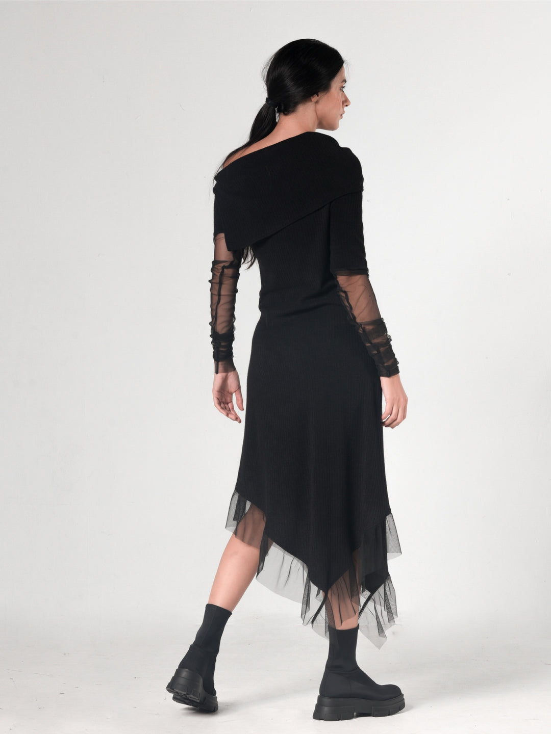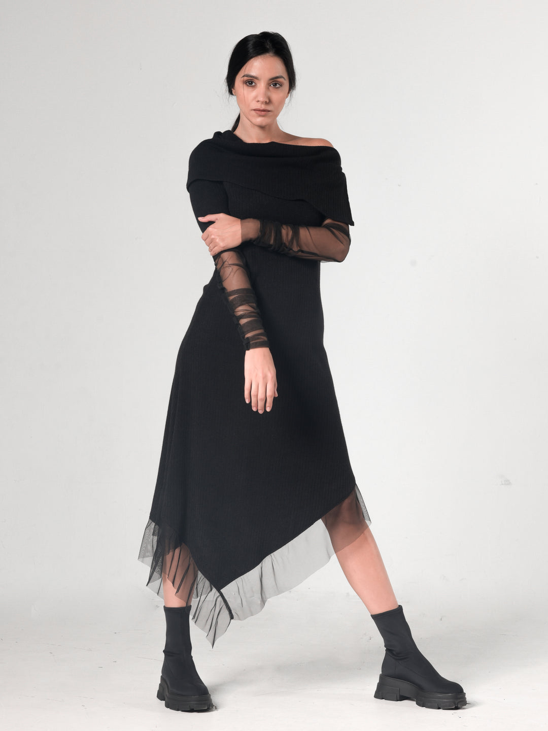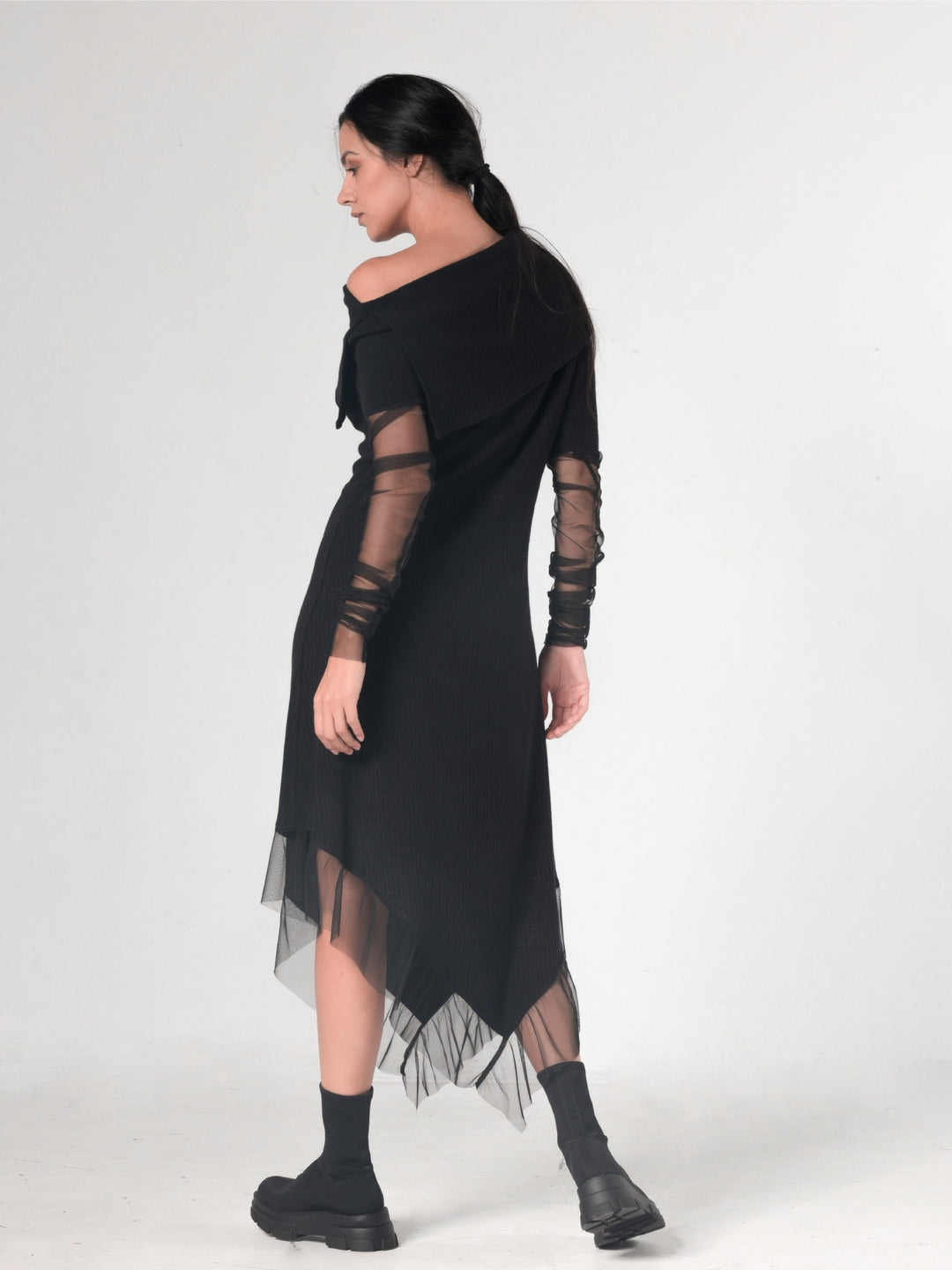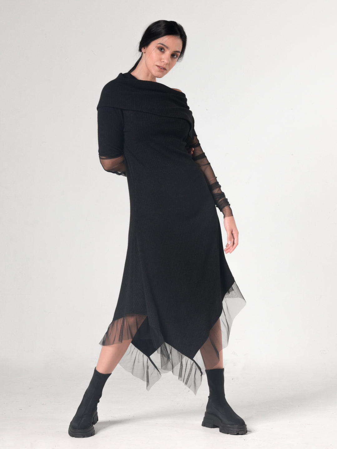 This asymmetric piece has black mesh on the sleeves and hem that look classy and elegant. This handmade creation is very flattering and looks great with both flats and heels. Can be worn both as a dress or a long tunic with leggings - the choice is yours! METD0210