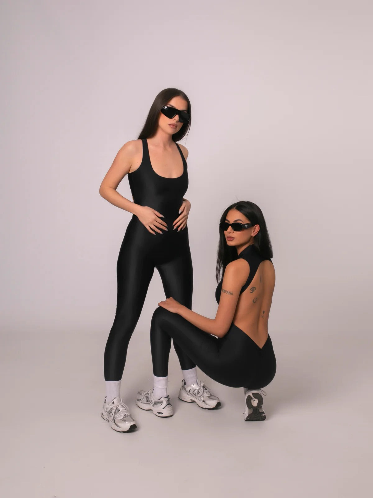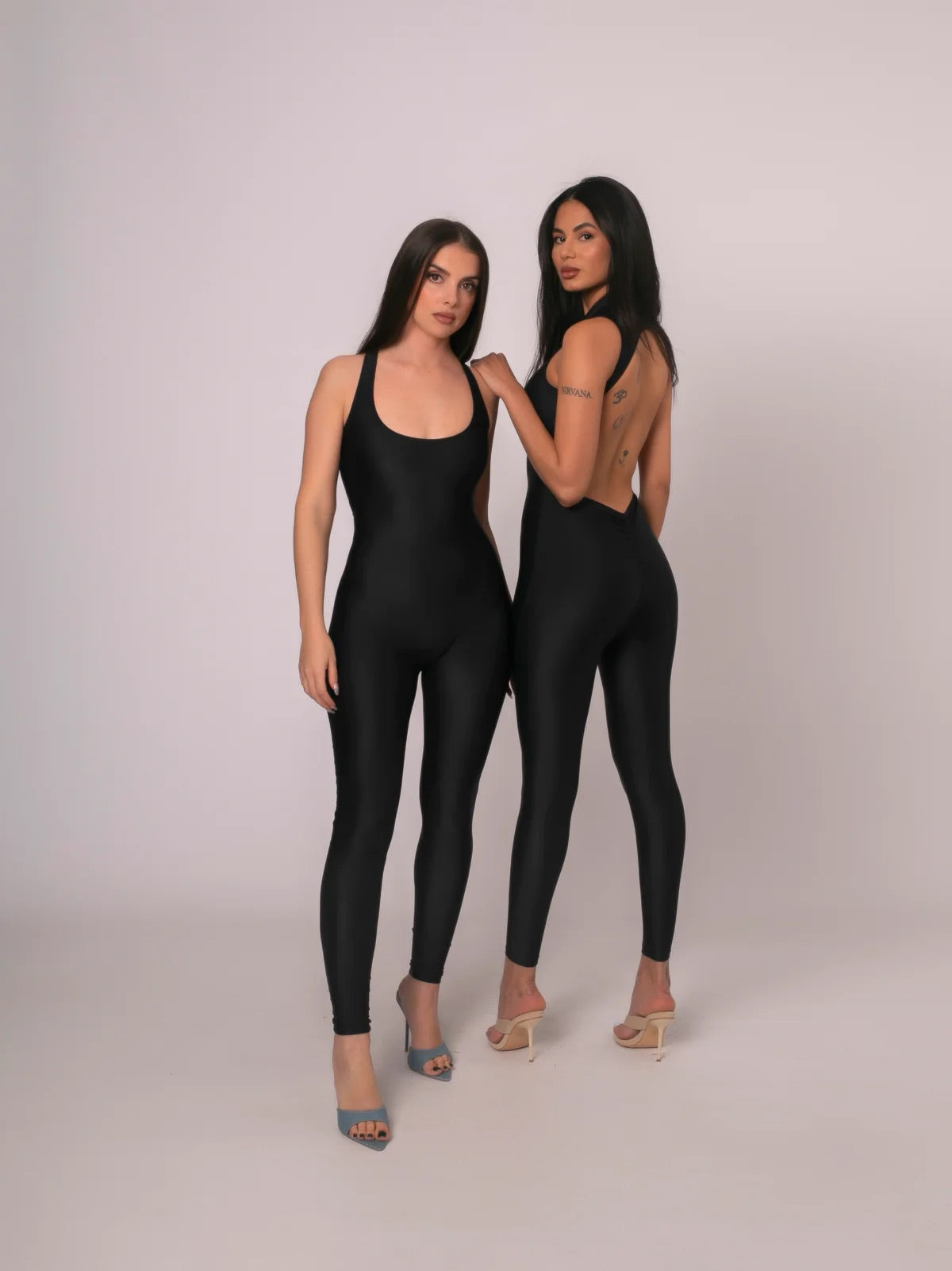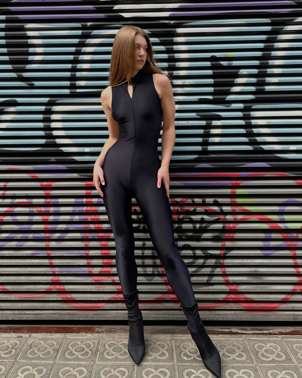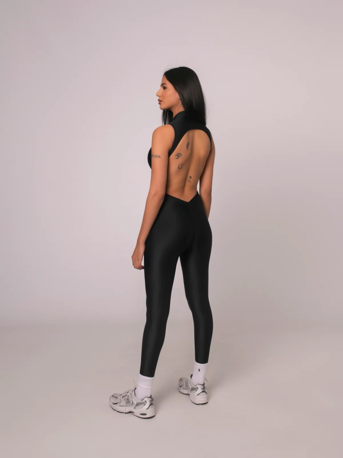 Black compression lycra jumpsuit with front zipper and super pronounced neckline on the back. Gathered push up effect to enhance the buttocks.