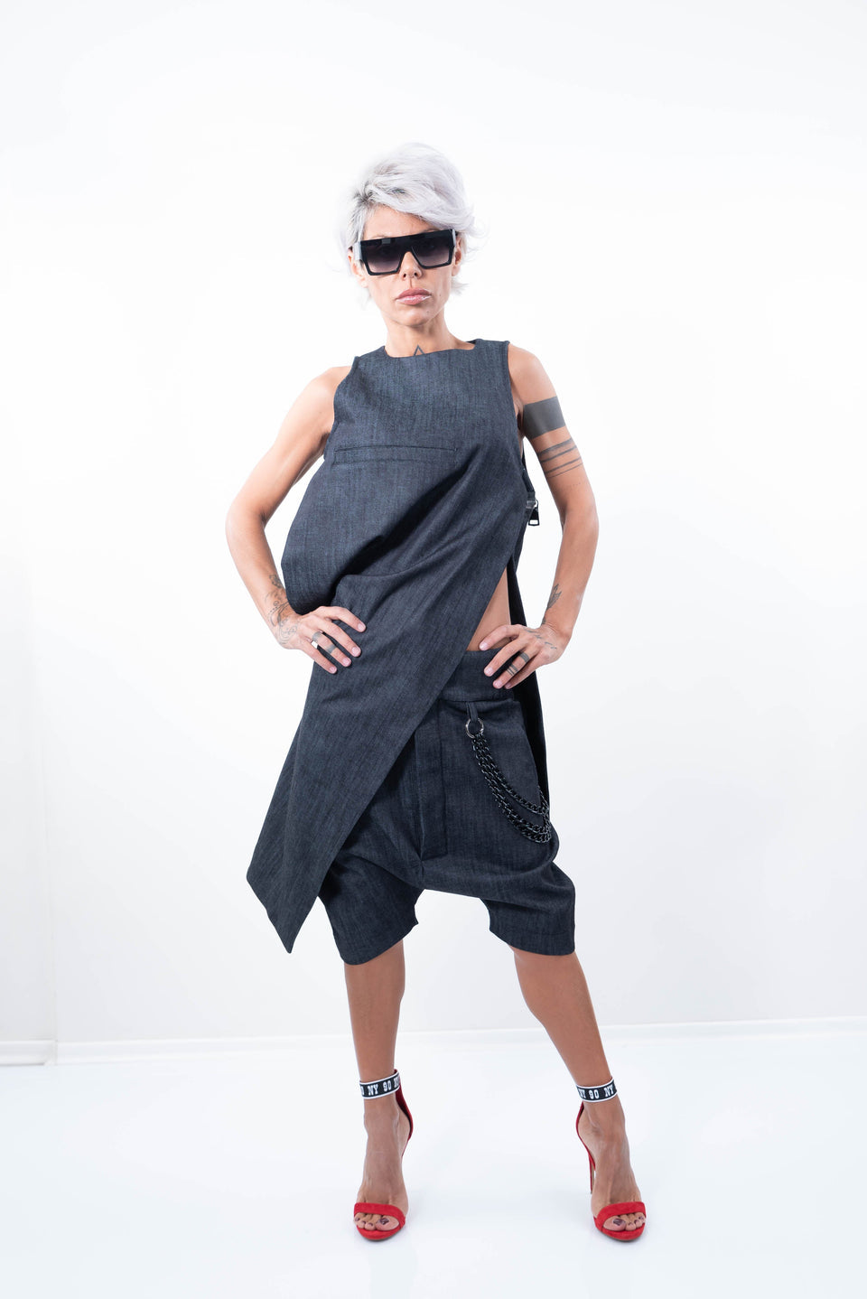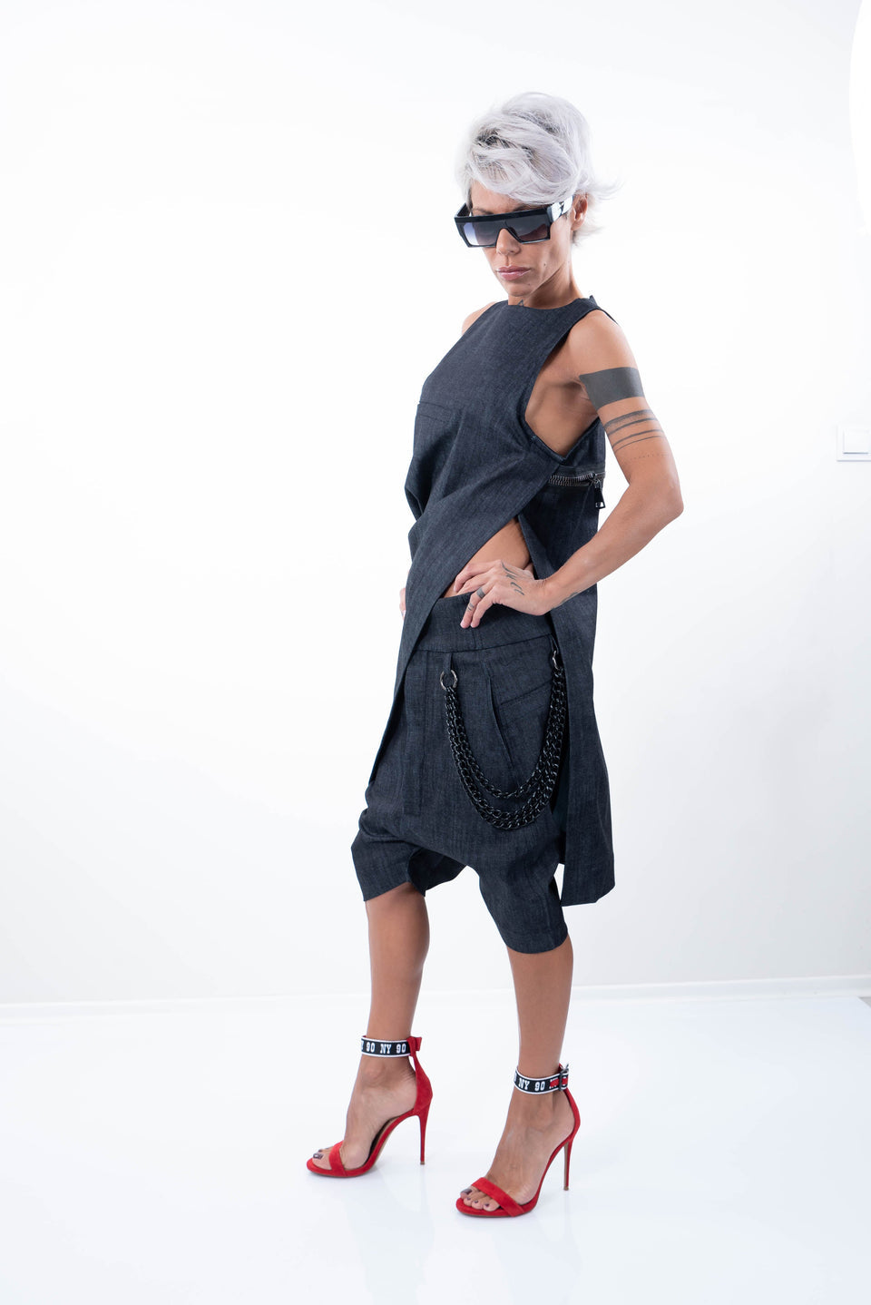 Denim tunic with side slits and an asymmetric low-high hem. Please note that the zipper and front pocket are for decorative purposes only.