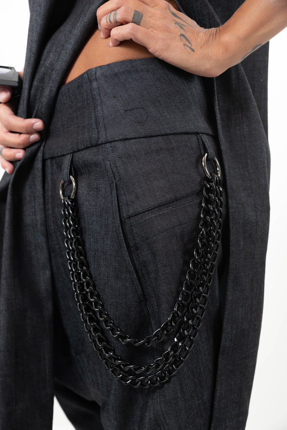 Drop-crotch mid-rise jean shorts with functional side pockets. Please note that the chain comes with the pants.