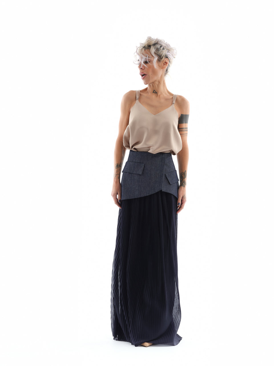Maxi high-waisted pleated skirt with a wide denim belt. Please note that this piece does not have pockets and is not lined.