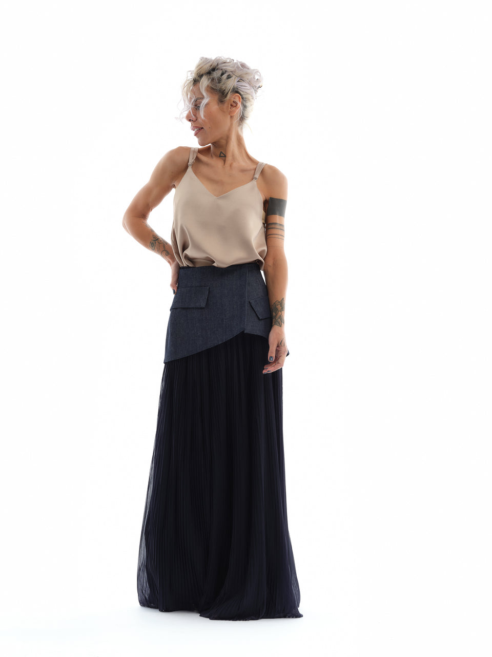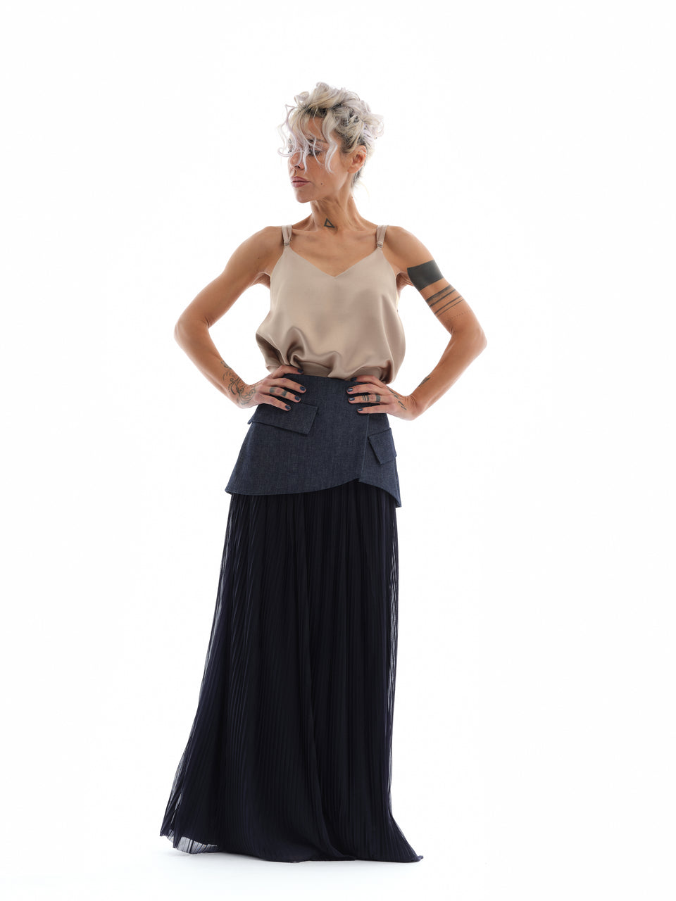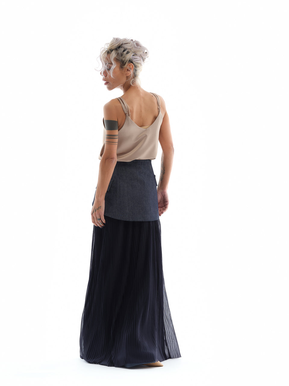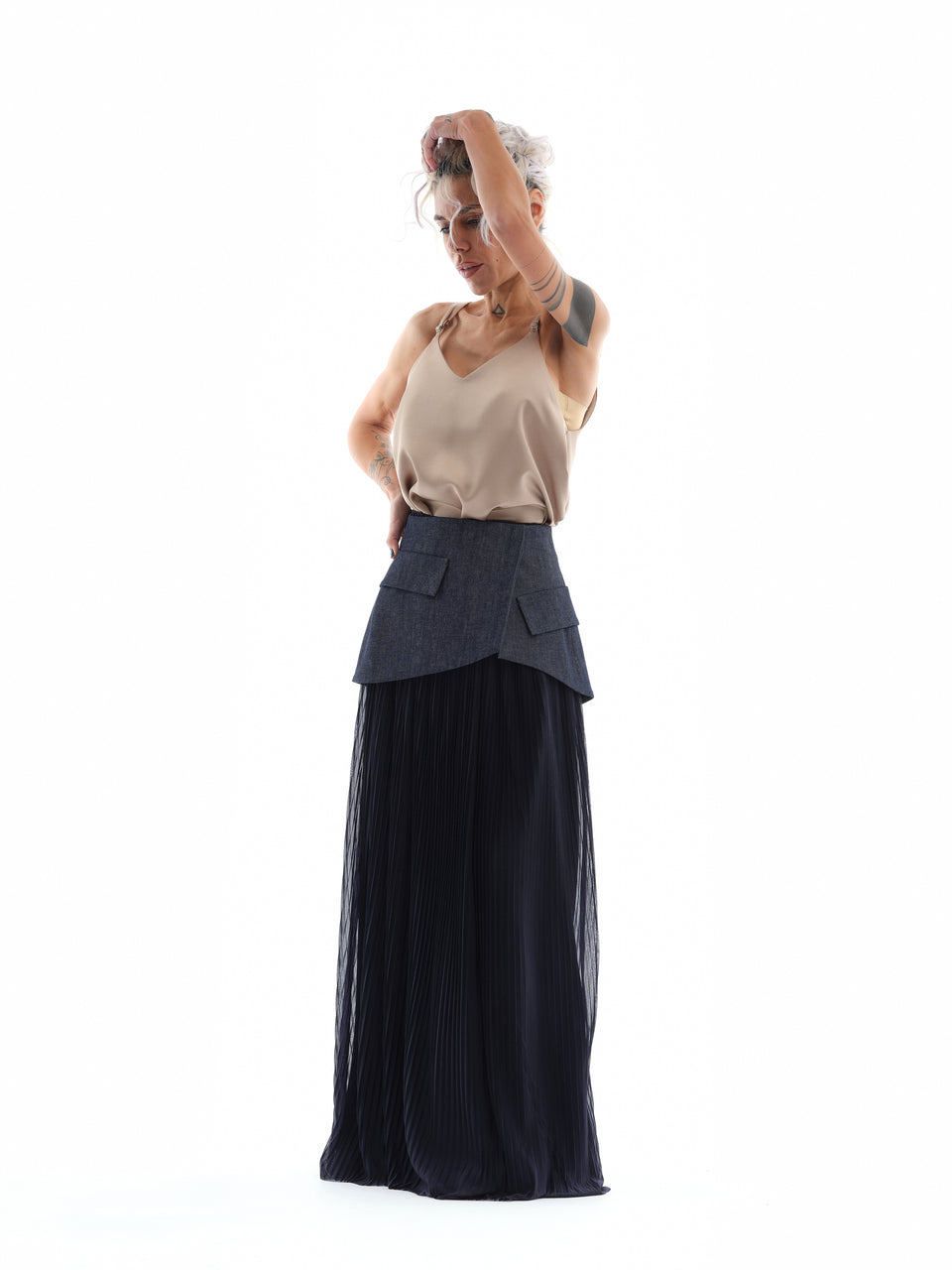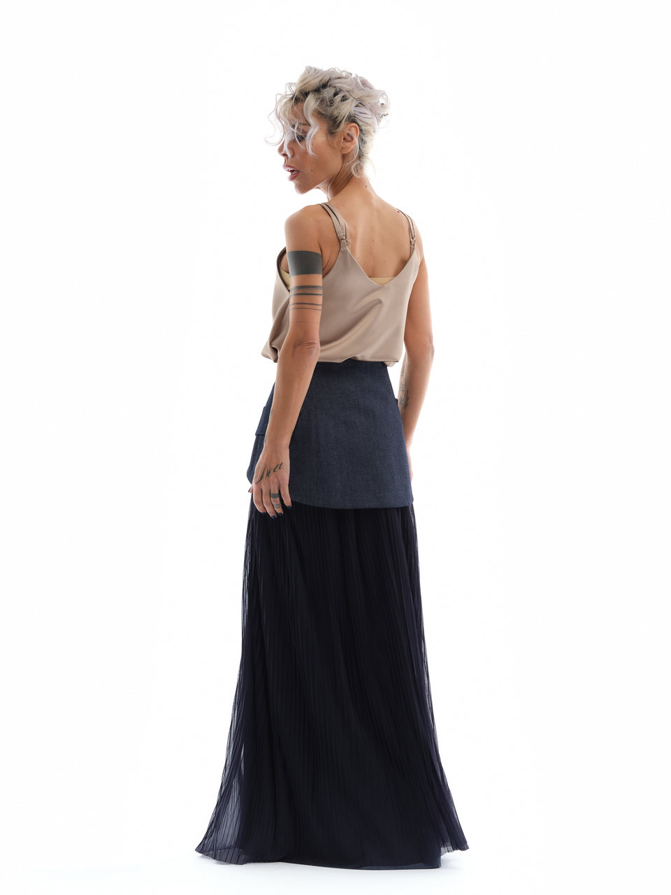 This extravagant piece features a denim top part that contours the waist and hips and a pleated underskirt that flows out to create a unique look that will elevate your elegant outfits.