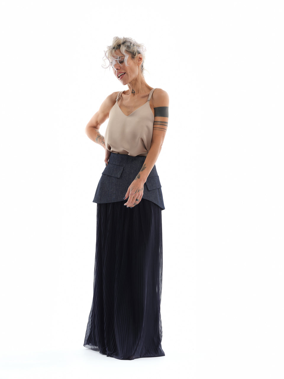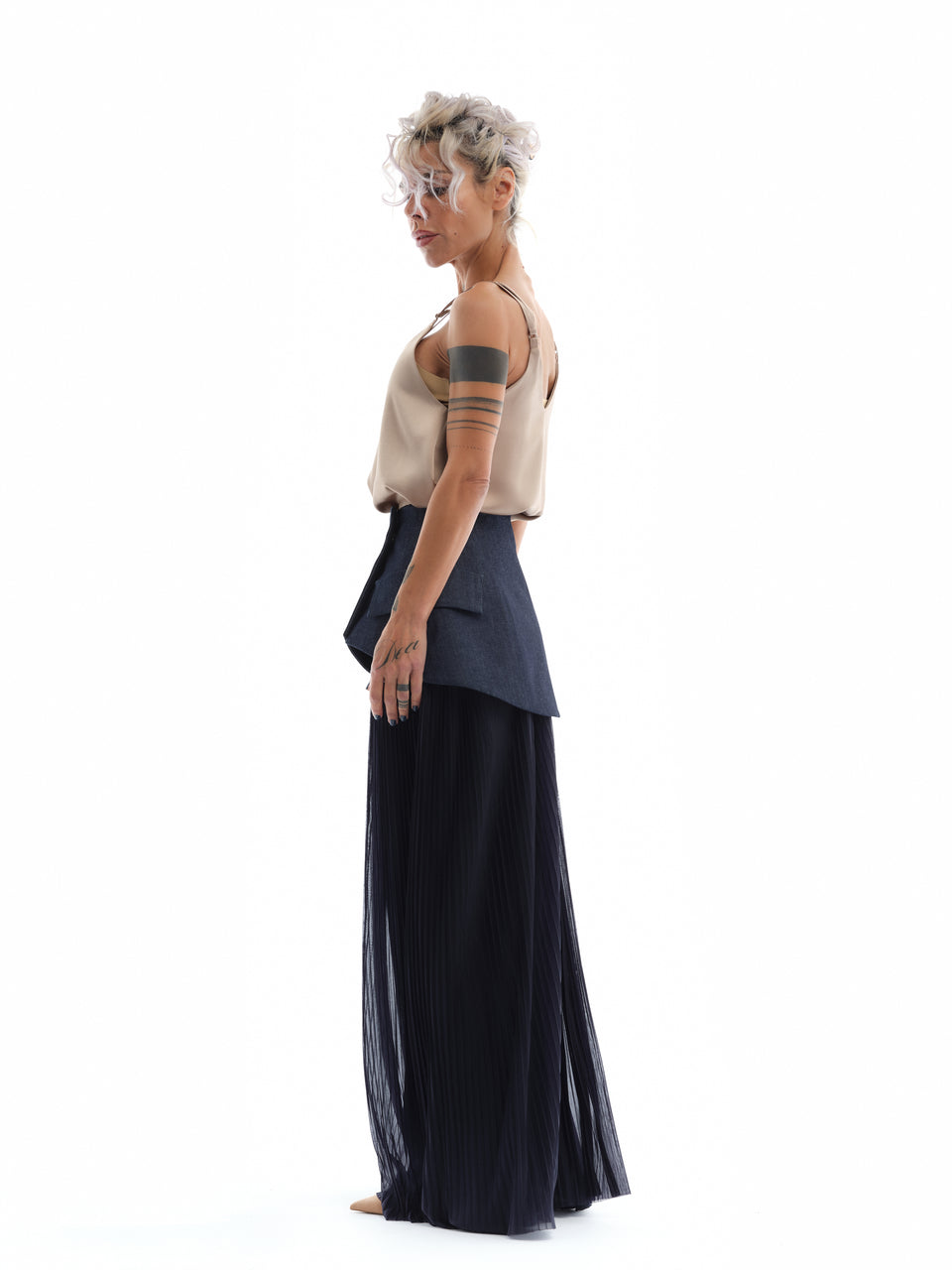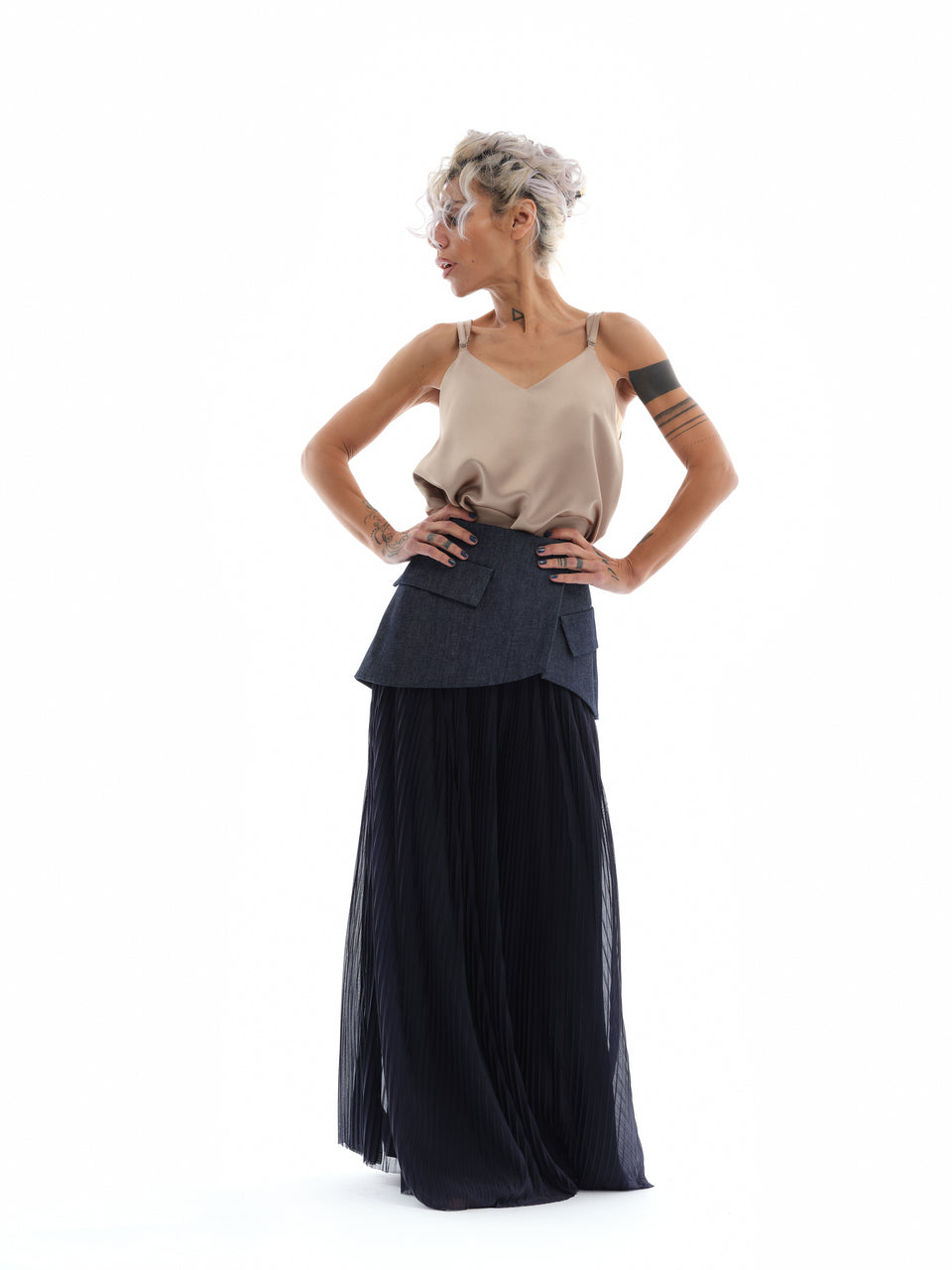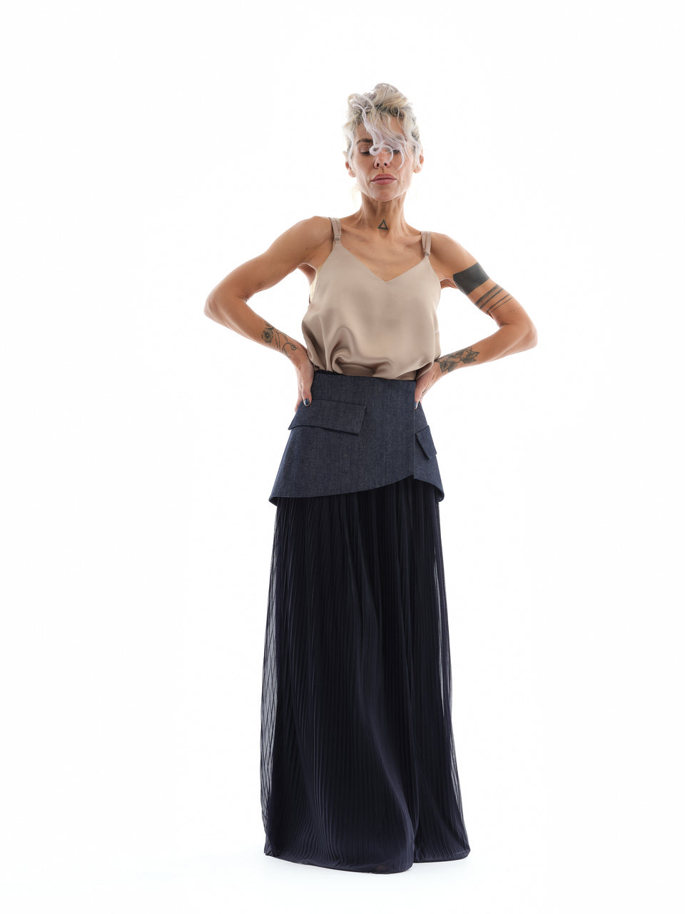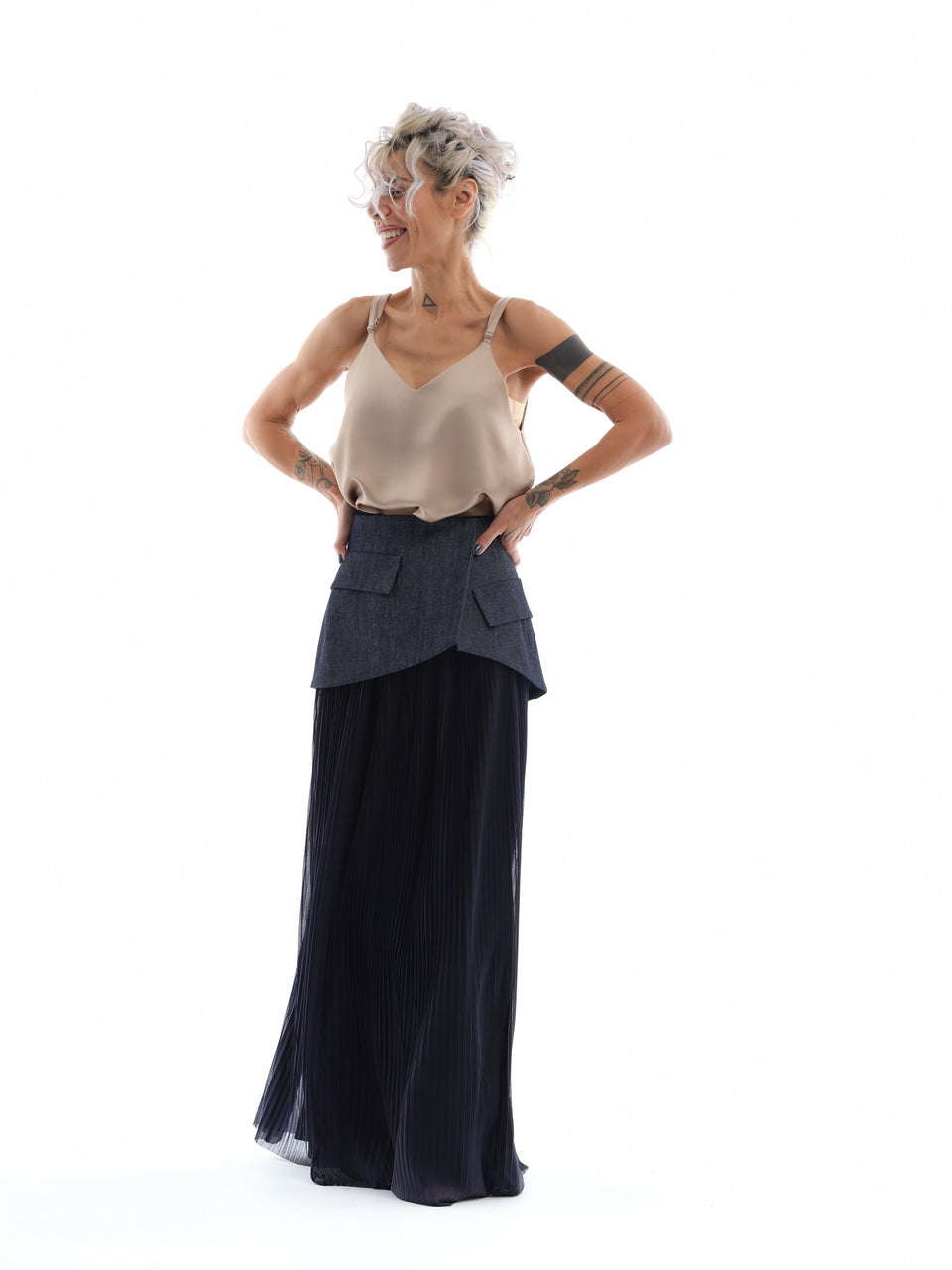 This extravagant piece features a denim top part that contours the waist and hips and a pleated underskirt that flows out to create a unique look that will elevate your elegant outfits.